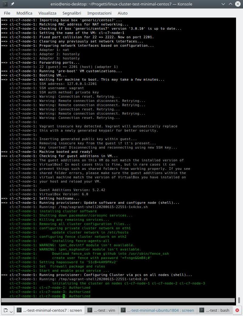Fatto ciò si può lanciare “vagrant up” in modo da avere un cluster Centos7 su 3 nodi oppure è possibile modificare il Vagrantfile in modo che si possa testare altre possibilità. Inoltre è possibile modificare il Vagrantfile anche successivamente e rilanciare di nuovo “vagrant up” per applicare i cambiamenti.